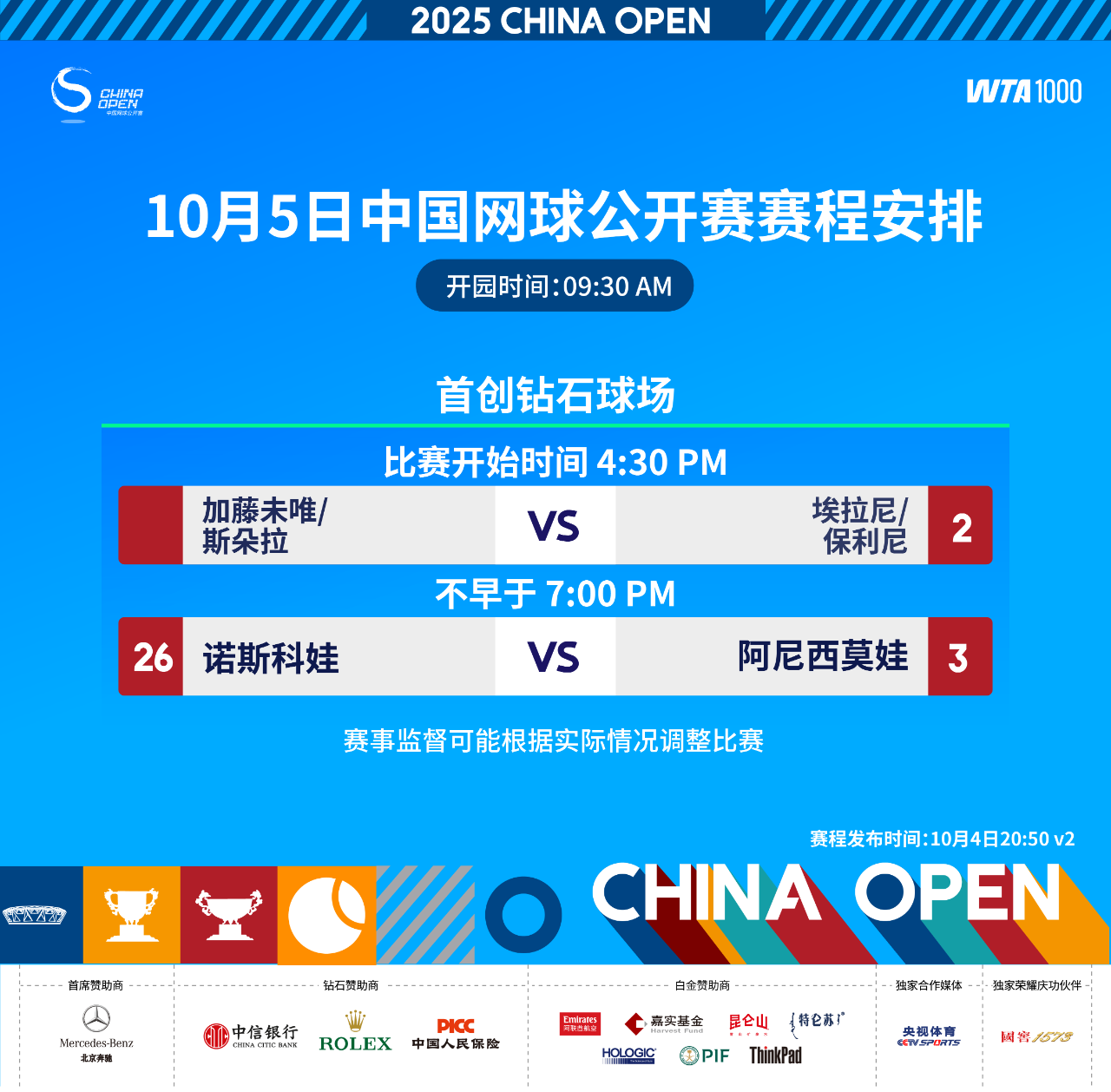 中网10月5日看点:阿尼西莫娃、保利尼/埃拉尼冲击冠军