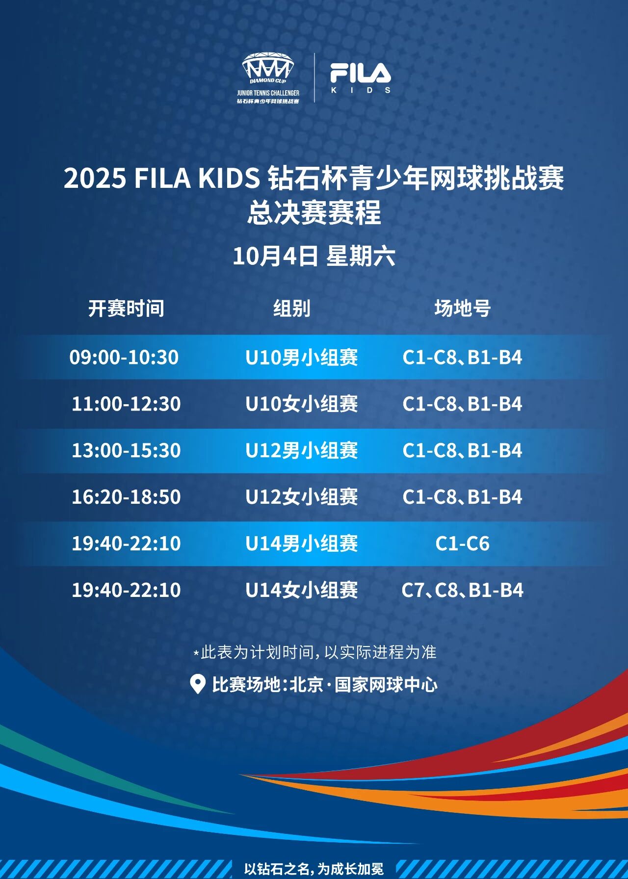 2025 FILA KIDS 钻石杯青少年网球挑战赛总决赛将于10月4日至10月6日在北京·国家网球中心举行。全国最强的青少年网球精英将汇聚一堂,这不仅是一场比赛,更是一张通往世界舞台的入场券。